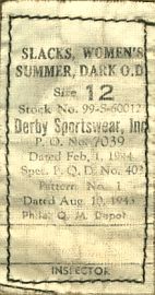 Etiquette spécifique d’un pantalon d’une Nurse. L’étiquette est datée du 1er février 1944 (pattern daté du 10 août 1943).