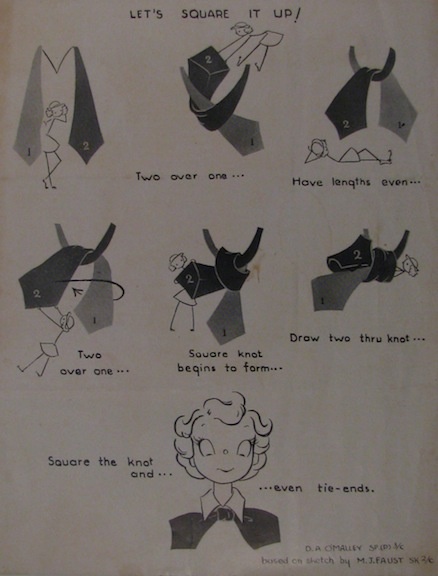 Cette cravate est utilisée pour les uniformes de la Marine depuis le XVIIIème siècle. Les cravates étaient noires ou bleu et faites en soie ou en rayonne. La cravate noire était portée avec la chemise blanche, la chemise bleue et l’uniforme de travail seersucker. La cravate bleue était portée seulement avec la chemise de même couleur. Elle était mise en dessous de col de la chemise avec le nœud place à l’ouverture du col et la cravate se finissait sur les côtés de la chemise.