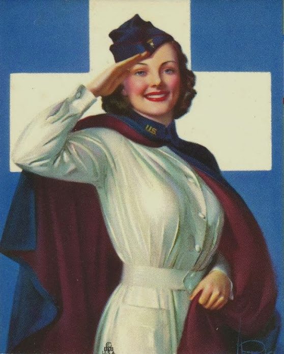 Les affiches d’époques ci-dessous montrent la cape bleue qui se porte avec la robe blanche d’hôpital, avec soit la coiffe blanche, soit le calot bleu.